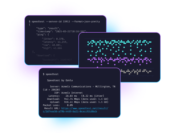 Speedtest CLI menghadirkan teknologi tepercaya dan jaringan server global di balik Speedtest ke baris perintah.